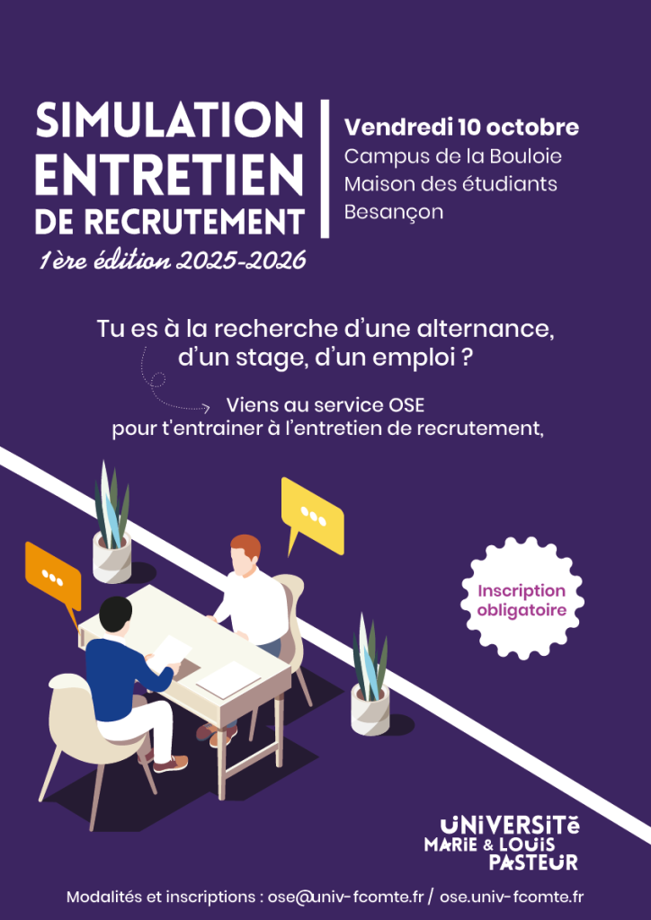 - Envoie ta candidature à ose@univ-fcomte.fr avant le 02/10/25, en mettant en objet : candidature pour simulation entretien